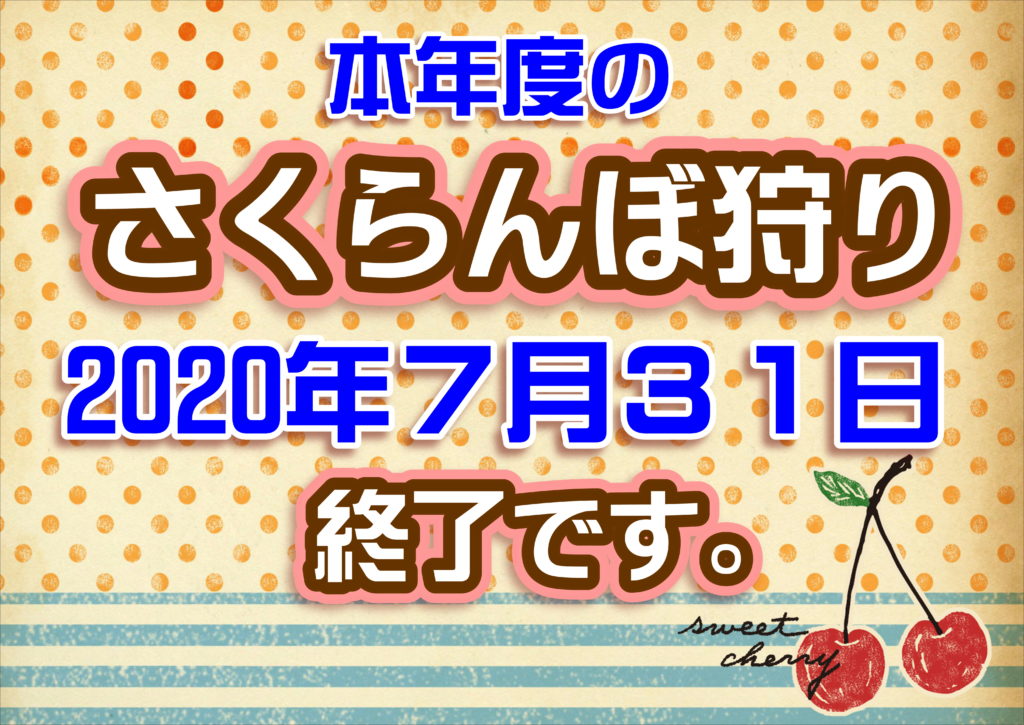 収量がほとんどなくなってきましたので、本年度のさくらんぼ狩りは7月31日で終了いたします。