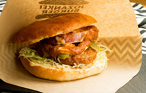 130サイズのボリュームがある定山渓ファームオリジナル手作りバンズにオージービーフの贅沢パティを挟んだ定山渓バーガーは、定山渓ファームで採れたフルーツを使ったソースと、きゅうりをピクルスにしてサンドした、ビッグサイズの食べごたえ満点のハンバーガーです。