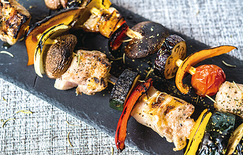 チキン、ポーク、季節の野菜を串にさした贅沢バーベキュー。