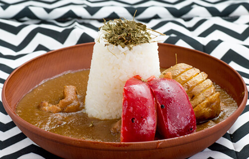 定山渓ファームの果物数種類と野菜とチキンを丁寧にコトコトと煮込み、多種類のスパイスをオリジナルで組み合わせて香高いフルーティーで奥深いソースが生まれました。